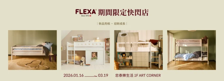 FLEXA 期間限定快閃店於 NOKE 忠泰樂生活 1F ART CORNER 登場,集結丹麥設計兒童家具新品,從單人床、上下舖、收納櫃到學習桌椅與兒童玩具,一次體驗孩子成長所需的理想家具。活動期間加入 FLEXA 會員,單筆消費滿 NT$10,000 現折 NT$888,並享多款床架與學習家具快閃限定優惠,打造安心、靈活的北歐兒童生活空間。