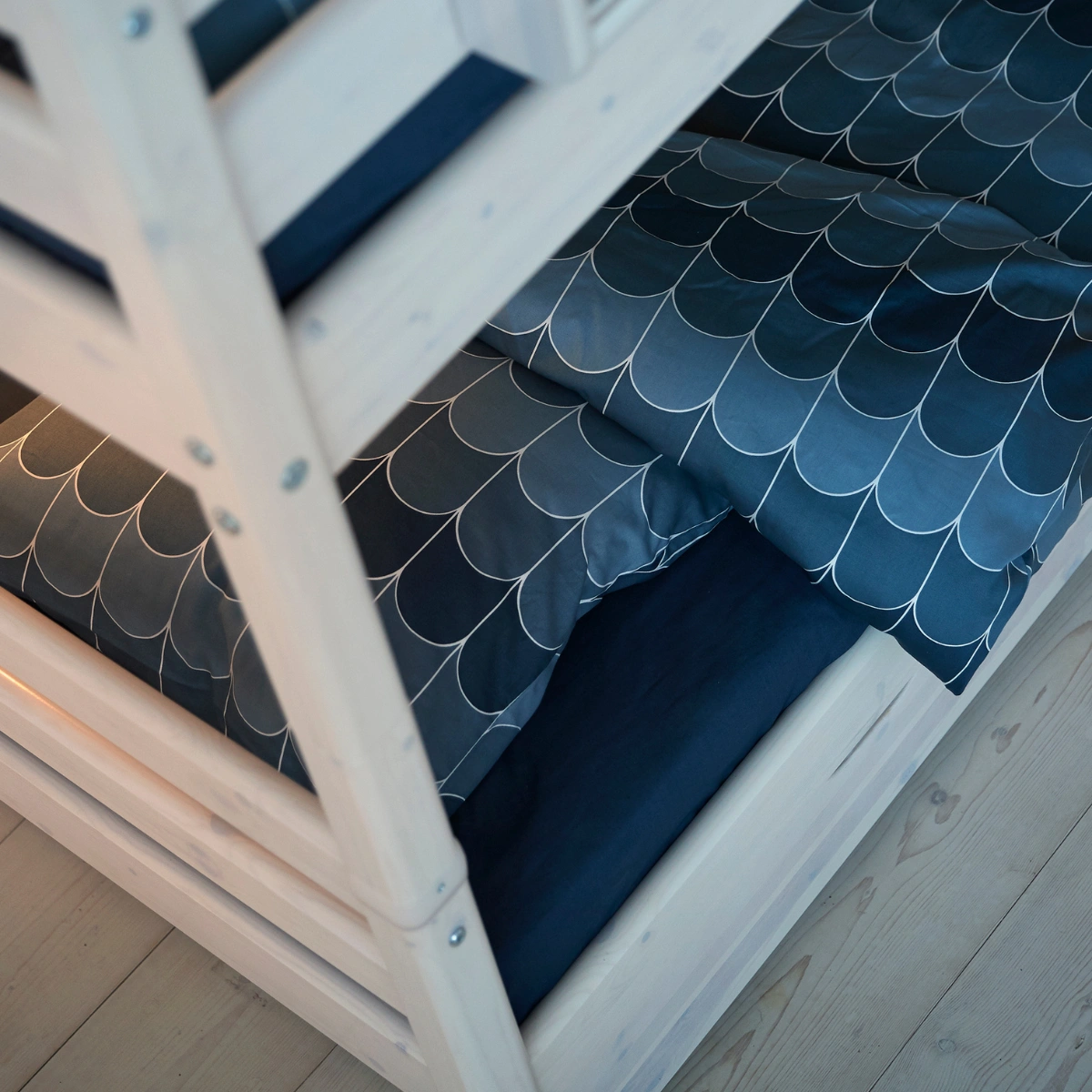 床下附有寬敞收納抽屜,非常適合存放孩子的寢具、玩具或日常用品,讓兒童房保持整潔有序。整體床架採用通過 FSC® 認證的實木松木製成,表面為溫潤的白洗色,展現自然質感與北歐風格。