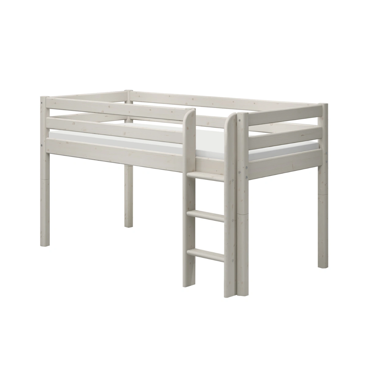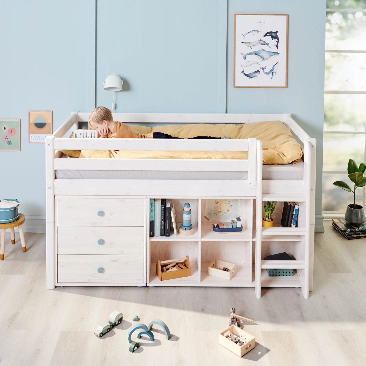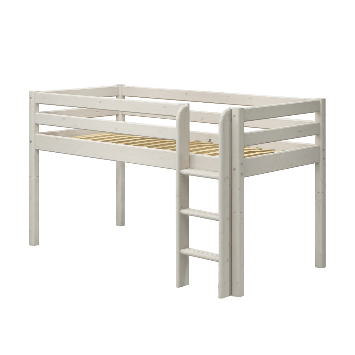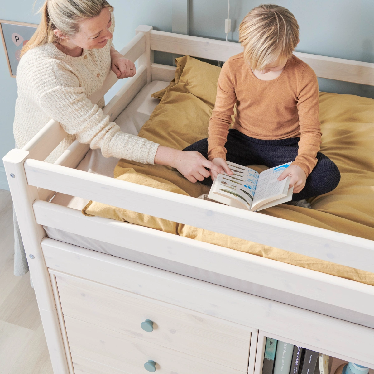 CLASSIC系列半高床專為兒童設計,附有防滑踏階的直梯,並可安裝於床的任一端,靈活因應空間需求。床下空間十分適合用於收納,或搭配 FLEXA 遊戲床品加上遊戲帳簾,打造專屬的秘密小天地;床面還可加裝遊戲小屋,增添更多樂趣。