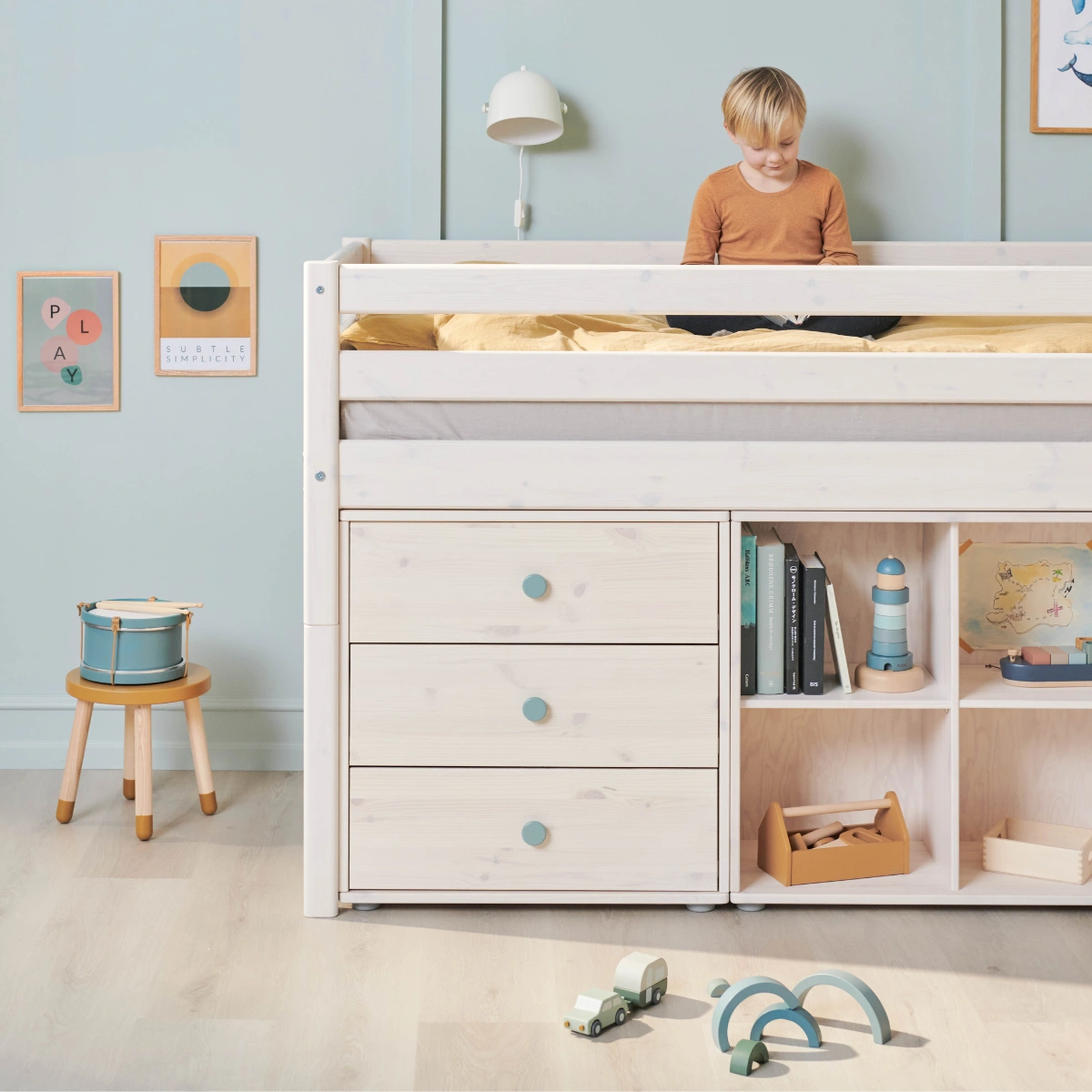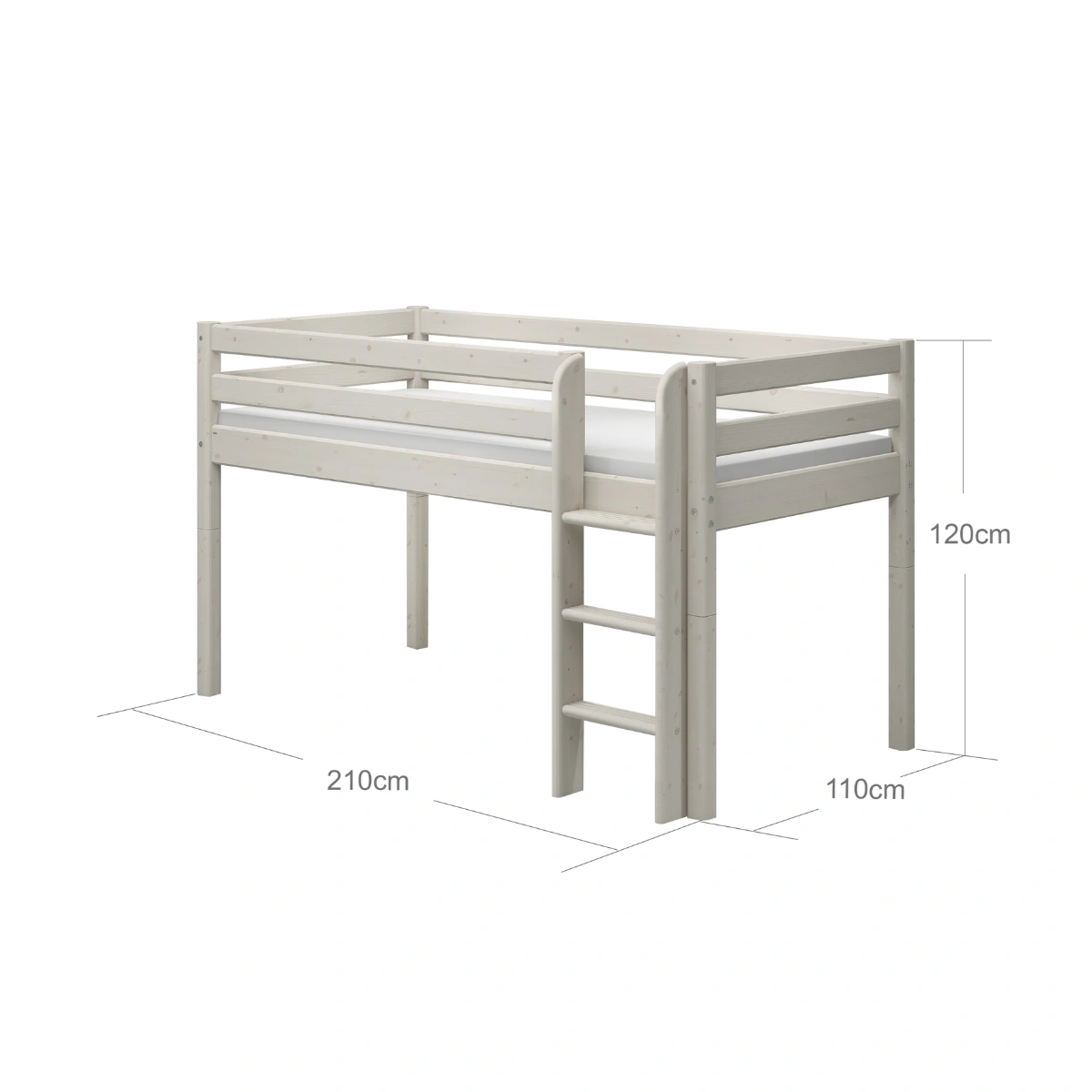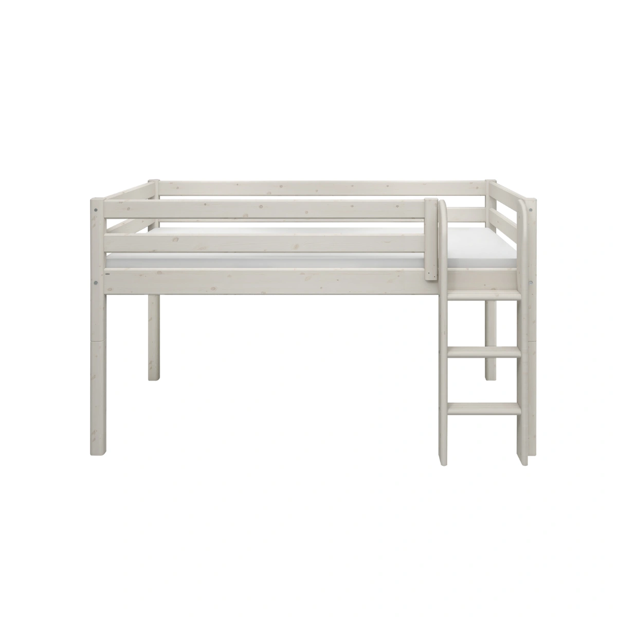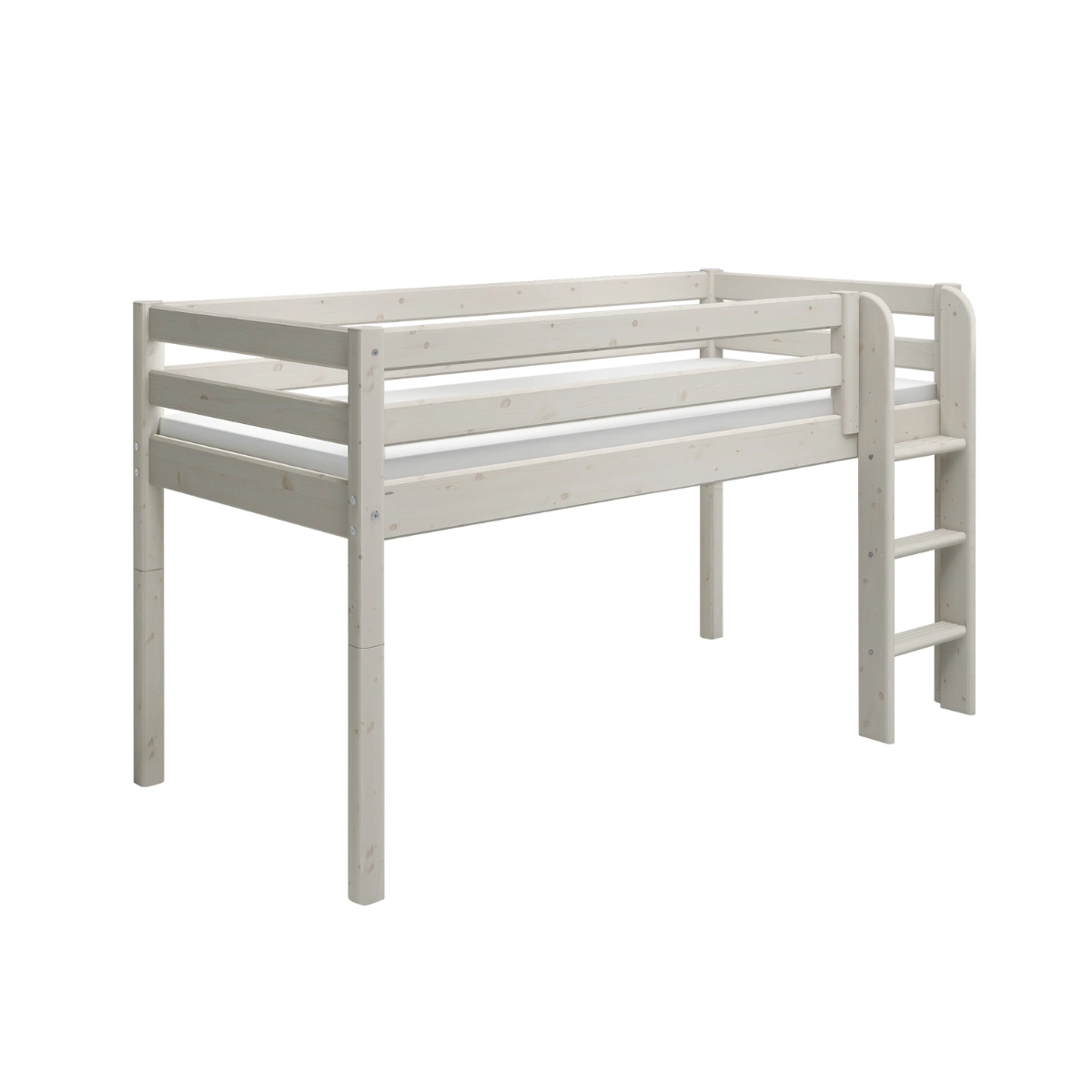 CLASSIC系列半高床專為兒童設計,附有防滑踏階的直梯,並可安裝於床的任一端,靈活因應空間需求。床下空間十分適合用於收納,或搭配 FLEXA 遊戲床品加上遊戲帳簾,打造專屬的秘密小天地;床面還可加裝遊戲小屋,增添更多樂趣。