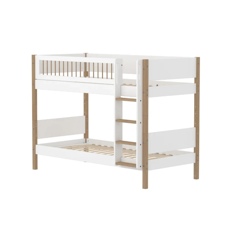 FLEXA NOR系列 雙層床搭配直立梯,是小坪數家庭的空間救星。樓梯設有防滑階梯與整合式把手,讓孩子上下更安心,並可依需求安裝於床的任一側。