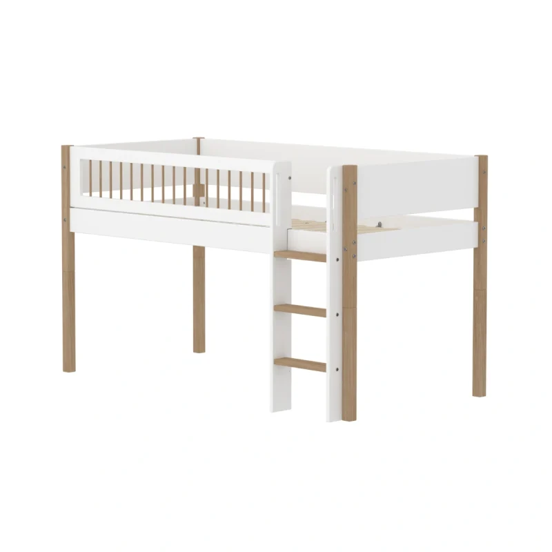 NOR 半高床配有直式梯子與安全護欄,是為孩子設計的理想床款。梯子設有防滑階梯與整合式扶手,並可依房間擺設安裝於床的任一側,兼顧安全與靈活性。