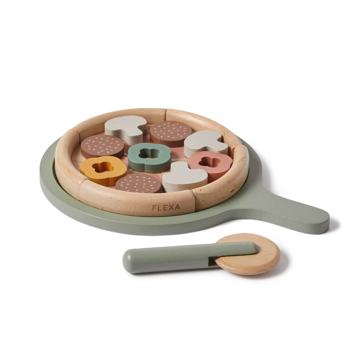 這組木製披薩玩具——包含披薩盤、切刀和多款配料——是孩子扮家家酒時的絕佳道具。孩子可以自由添加配料、切分披薩,不僅能強化手部精細動作,更能透過招待家人或朋友(無論是真人還是想像中的客人),培養孩子的社交能力。身為家長,您或許會發現玩具總是悄悄佔據家中各個角落,但 FLEXA 這系列玩具採用柔和色系設計,能自然融入家中擺設,成為空間的一部分。