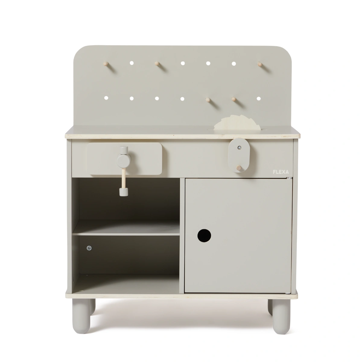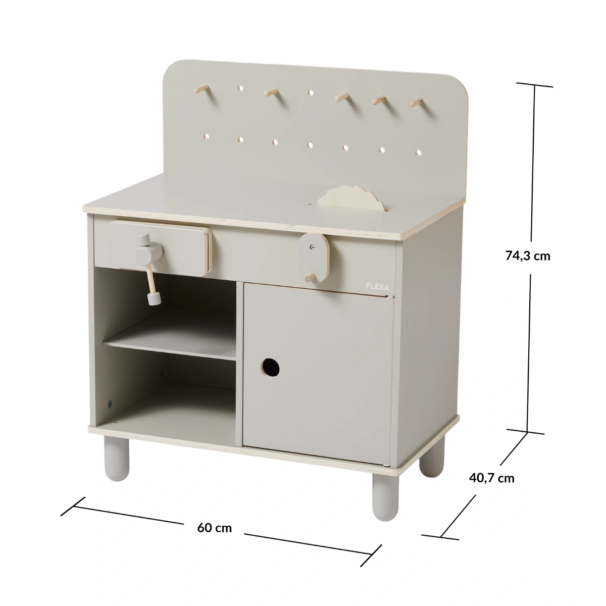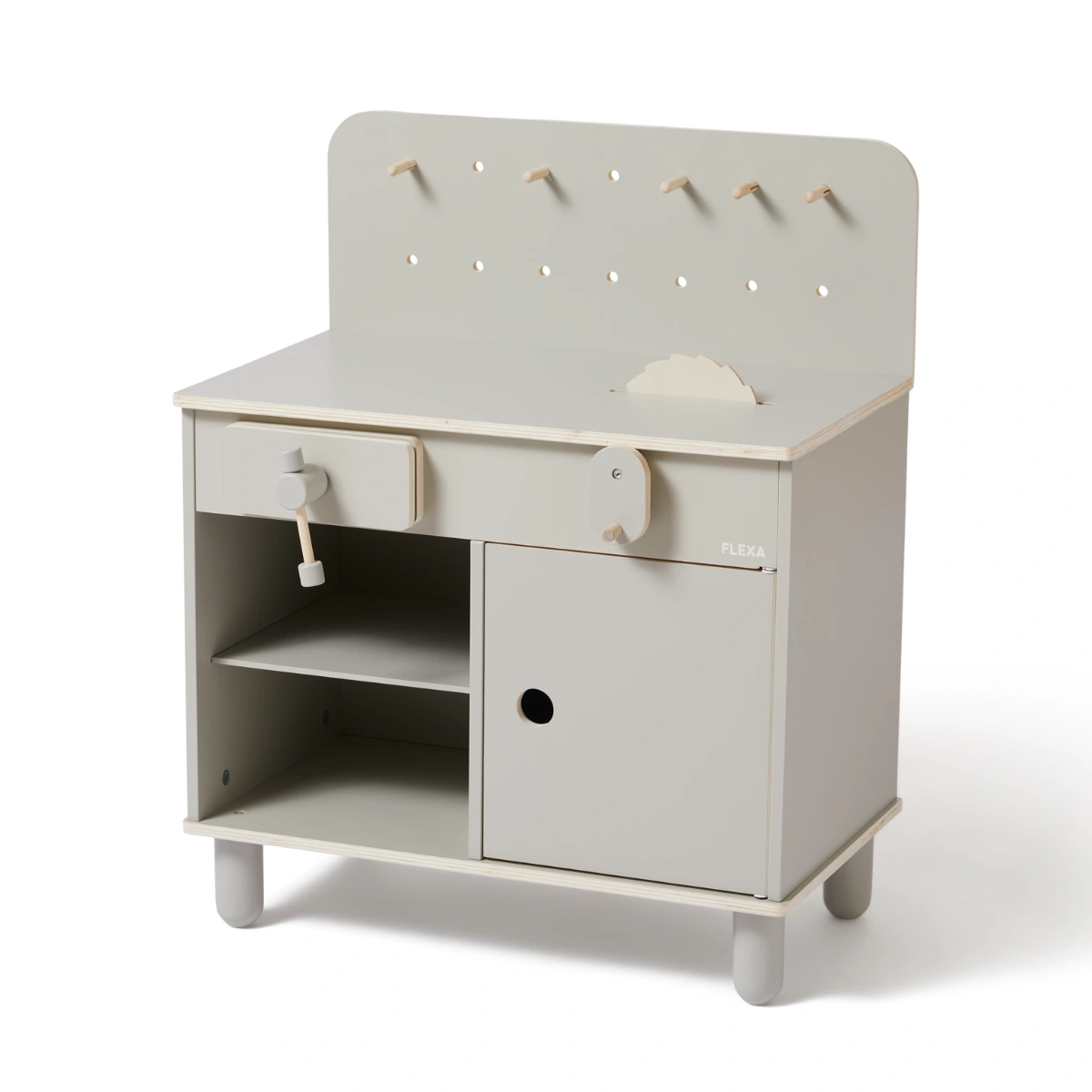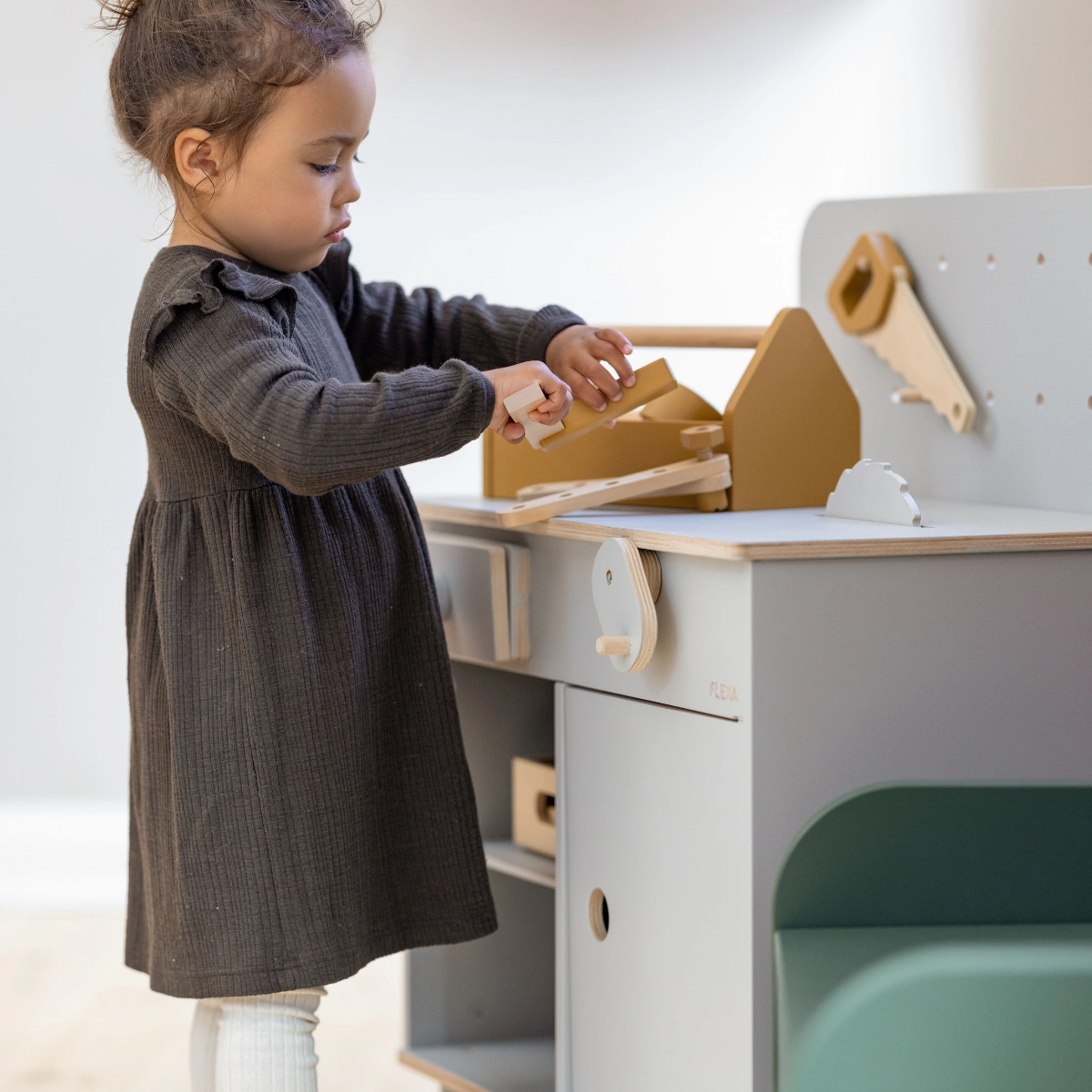 FLEXA PLAY系列工作臺為小小工匠打造一個專屬空間,盡情敲敲打打、旋轉螺絲,從想像中建構屬於自己的傑作。這款精緻的遊戲組以實心樺木與 MDF 製成,結合經典丹麥設計與教育型遊戲理念,在遊戲中全面支持孩子的成長發展。